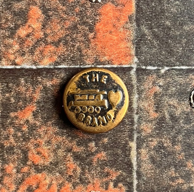 アメリカの老舗ワークウェアブランド S.O.&Co.(Sweet-Orr) のチェンジボタン。 1900〜1908年頃に使われていたもので、表面には当時の工業化と働く人々を彷彿とさせる 列車(機関車)の意匠 が丁寧に刻まれています。 力強さと移動・勤労の象徴を併せ持つデザインは、当時のワーカーたちの暮らしや時代背景を想像させます。 裏面には経年による擦れやサビ・黒ズミがあり、使い込まれた風合いがヴィンテージの本物感を伝えます。 シャンク(取り付け部分)はしっかりしており、リメイク・アクセサリー素材としても、コレクションの飾りとしてもおすすめです。 大小2個セットの販売になります。 □サイズ:直径 約18mmと15mm □年代:1900〜1908年頃 □デザイン:列車(機関車) 時代を運んできた小さな一粒。Sweet-Orr の歴史を感じられる、存在感あるヴィンテージピースです。